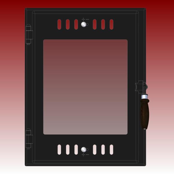 Dvířka ocelová mají jednoduchou konstrukci s použitím silného plechu 4mm a odlévaných masivních prvků (pantů a uzávěru).Regulace vzduchu je lamelou na dvířkách,prim a sec.